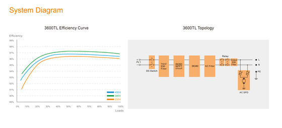 | Protezioni integrate | Polarità inversa CC, cortocircuito, sovracorrente in uscita, sovratensione in uscita, monitoraggio della resistenza di isolamento, rilevamento della corrente residua, protezione contro le sovratensioni, protezione anti-isola, protezione da sovratemperatura | |||||||